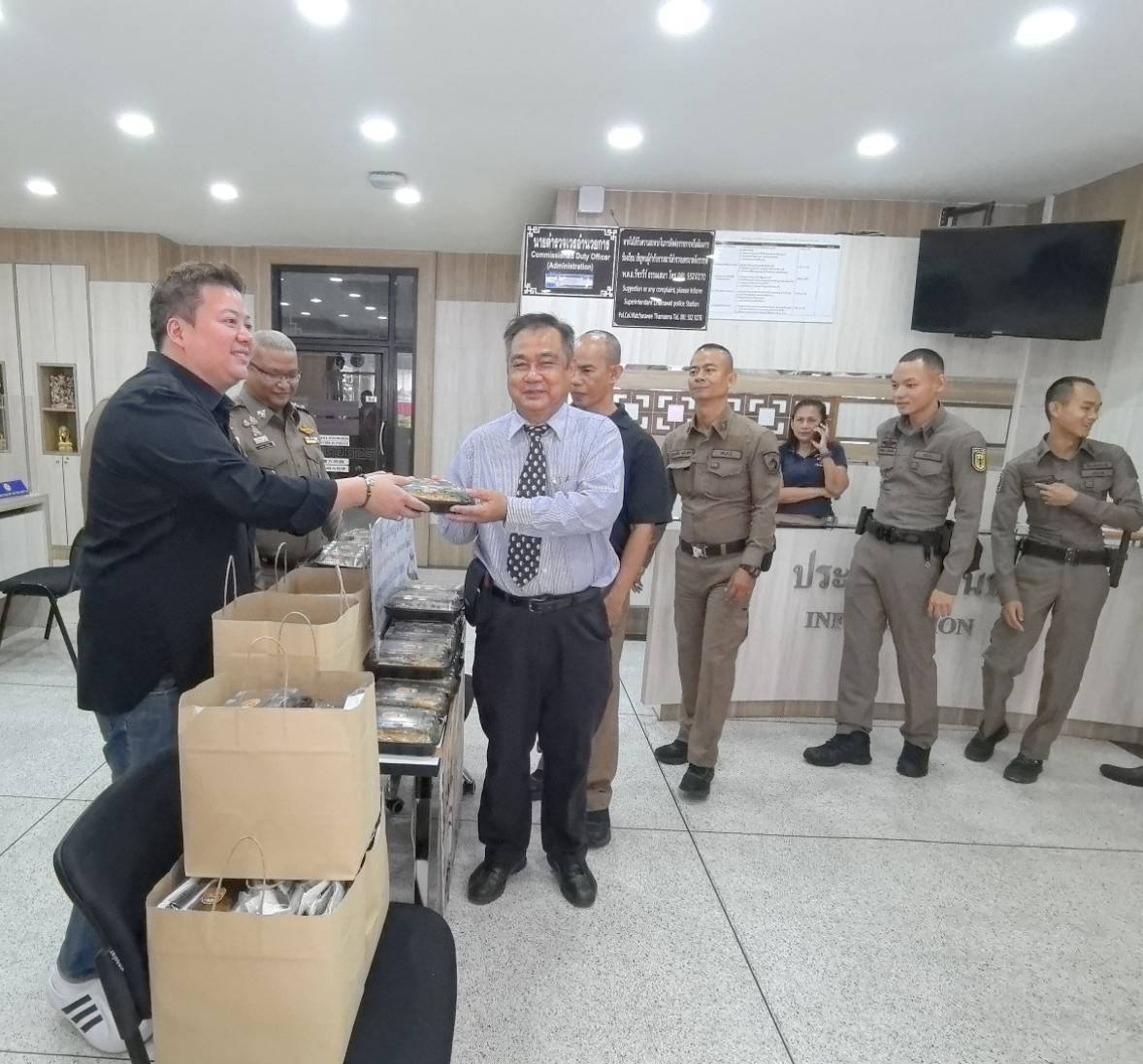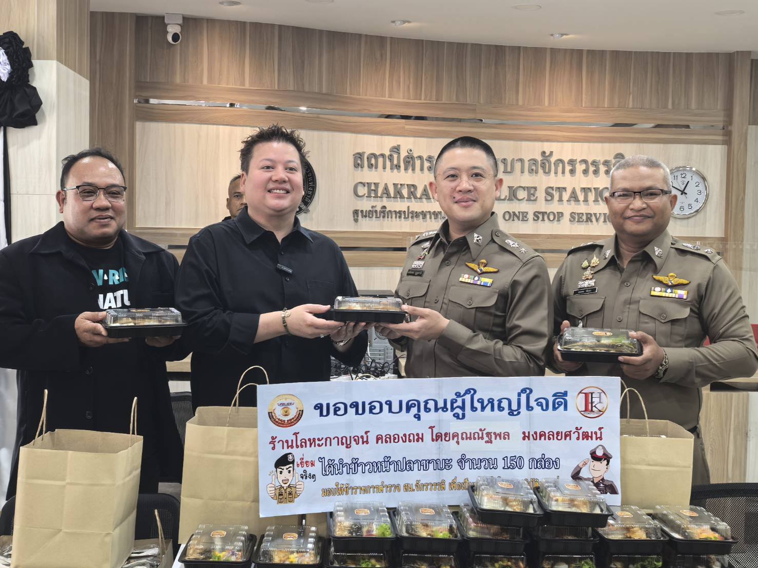 โดยกิจกรรมเริ่มต้นที่บริเวณที่ทำการ สน.จักรวรรดิ ทางคณะผู้ใจบุญได้มอบ ข้าวกล่องหน้าปลาซาบะ จำนวน 150 กล่อง เพื่อเป็นขวัญและกำลังใจให้กับข้าราชการตำรวจที่ปฏิบัติหน้าที่ และแจกจ่ายให้กับประชาชนที่เดินทางมาติดต่อราชการได้รับประทาน