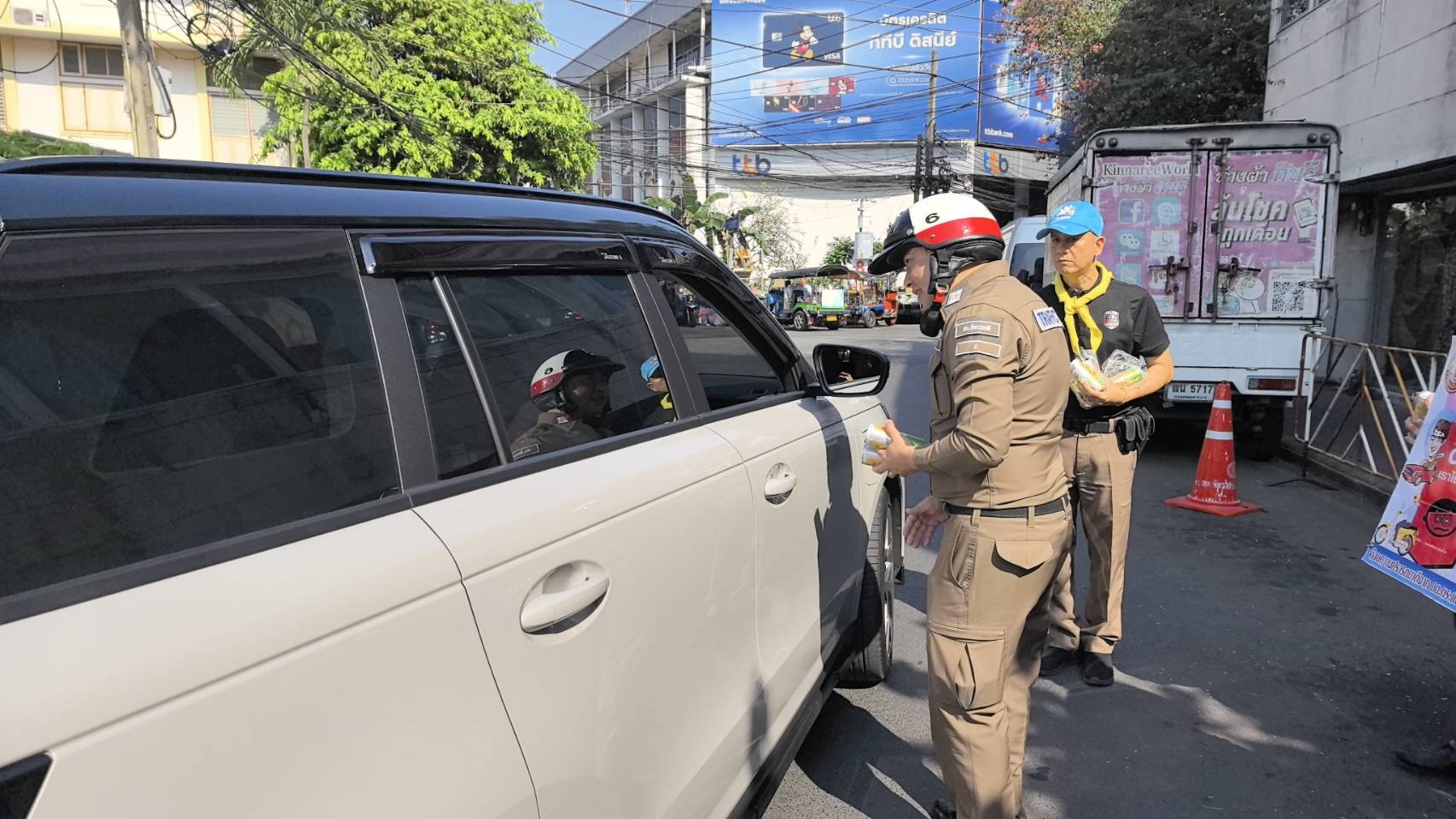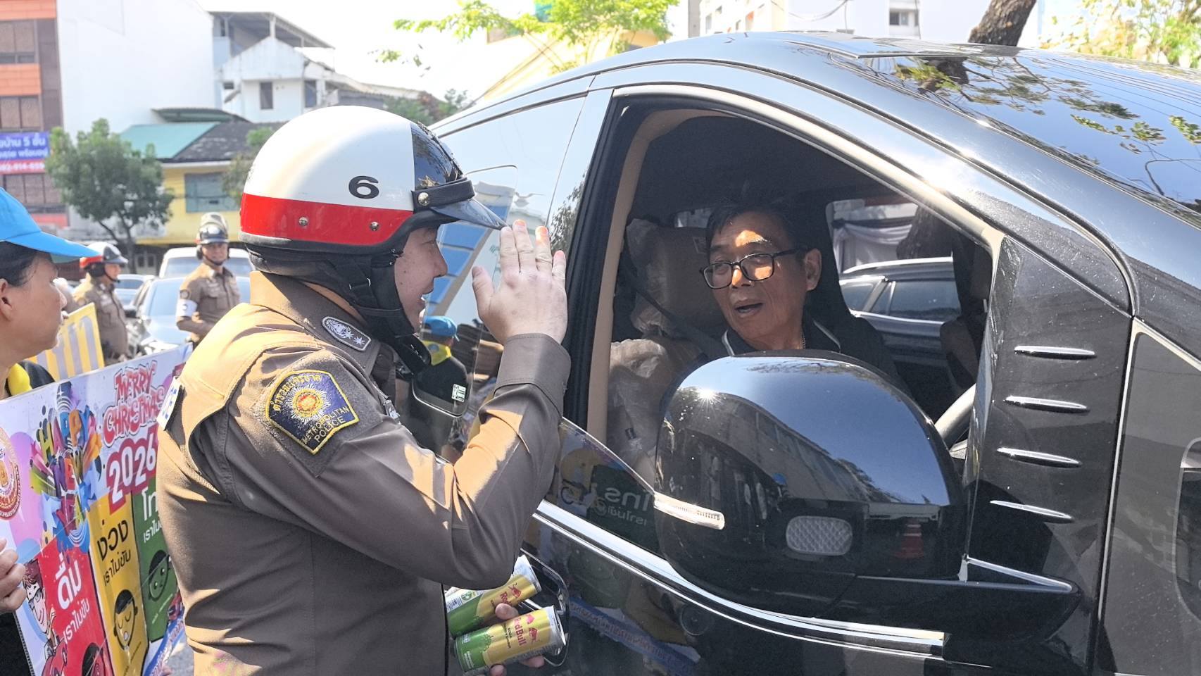 แจกความสดชื่น: มอบเครื่องดื่มชูกำลังให้กับผู้ใช้รถใช้ถนน เพื่อให้ตื่นตัวและขับรถอย่างปลอดภัย ไม่ง่วงนอน