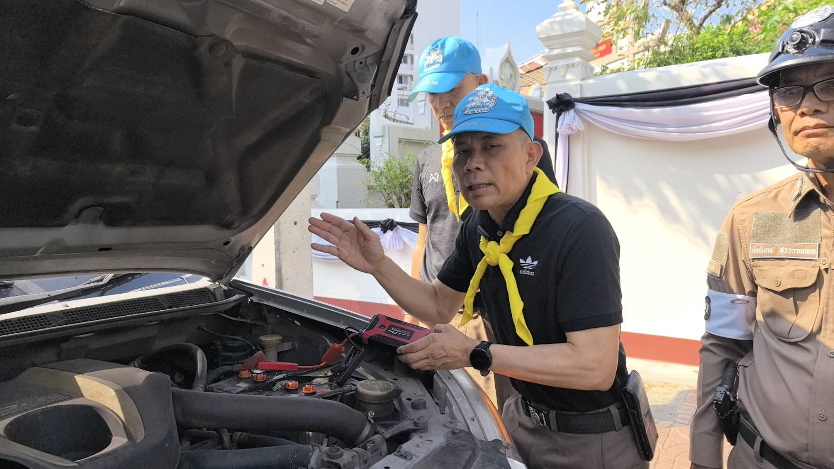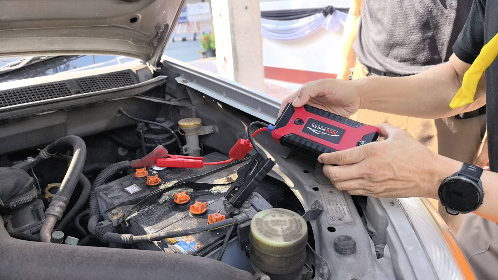 สาธิตอุปกรณ์กู้ชีพรถยนต์: สาธิตวิธีการใช้งานเครื่องกระตุ้นแบตเตอรี่พกพา (Jump Starter) เพื่อช่วยเหลือประชาชนกรณีรถเสียฉุกเฉิน