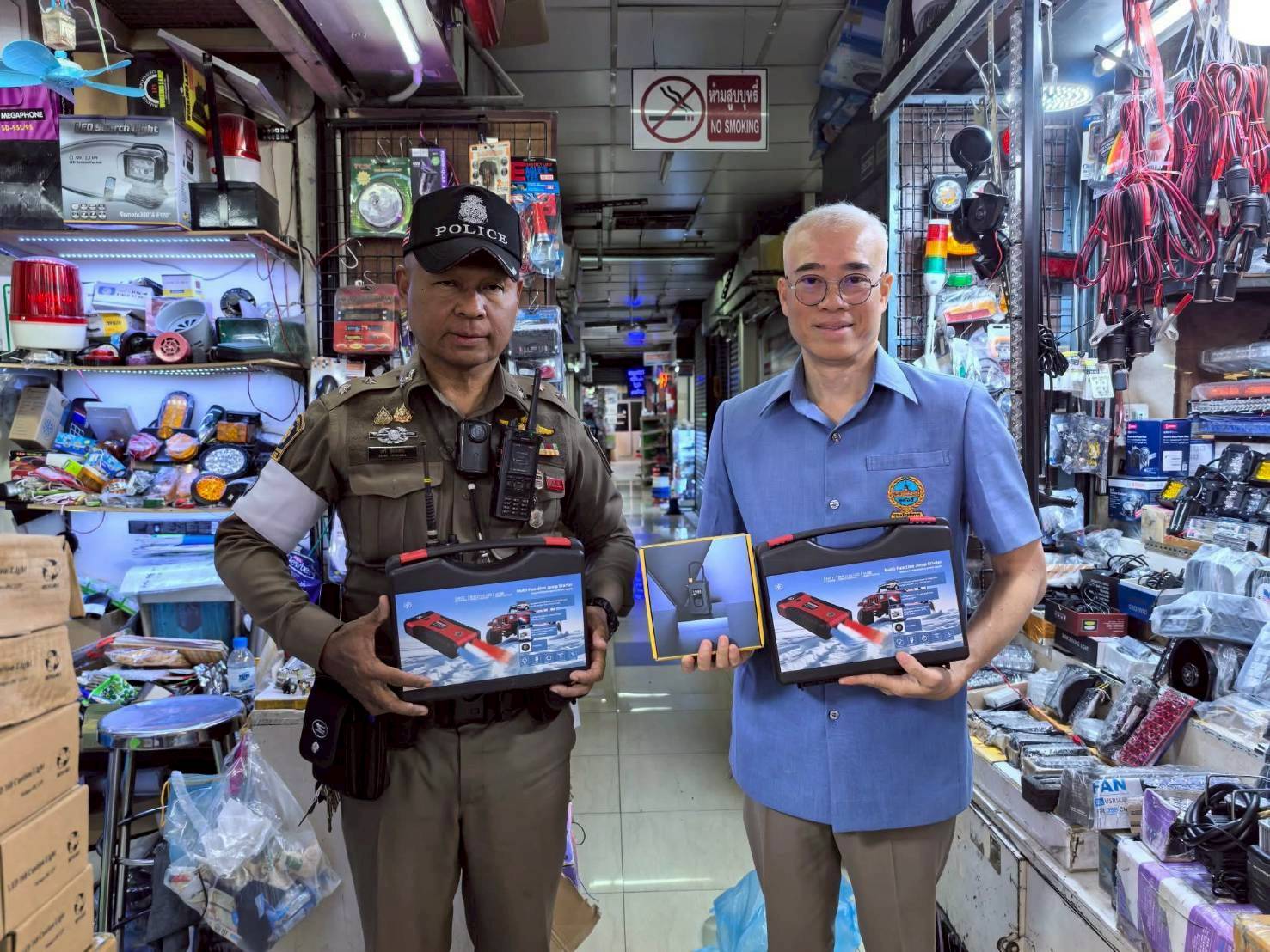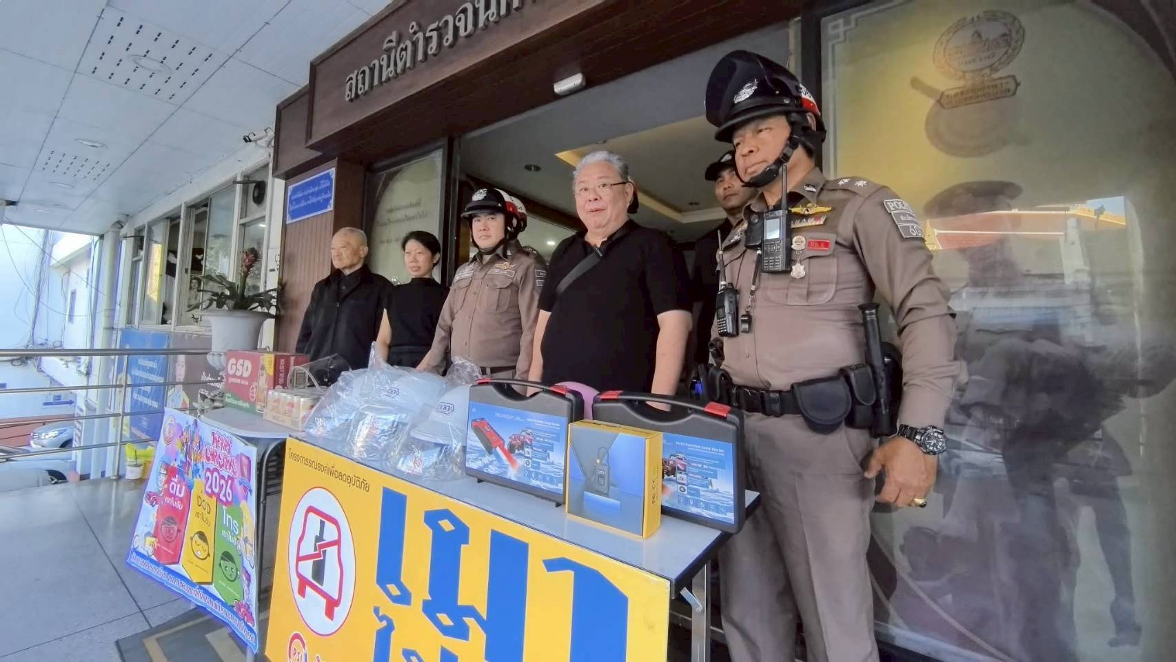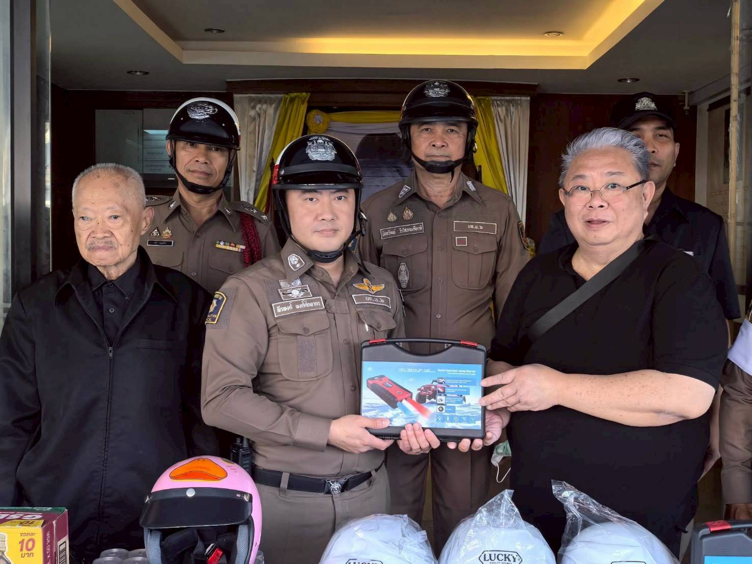 ในการนี้ ทางคณะ กต.ตร. ได้สนับสนุนและมอบ เครื่องกระตุ้นแบตเตอรี่รถยนต์แบบพกพา (Jump Starter) จำนวน 2 เครื่อง และ เครื่องปั๊มลมแบบพกพาสำหรับเติมลมยางรถยนต์ จำนวน 1 เครื่อง ให้กับงานจราจรและงานตำรวจชุมชนสัมพันธ์